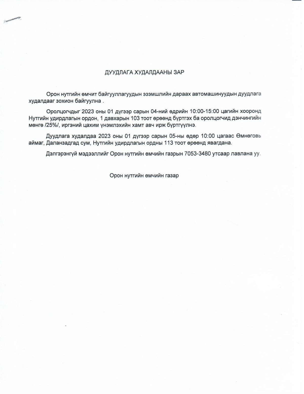 ДУУДЛАГА ХУДАЛДААНЫ ЗАР, АВТОМАШИНЫ ДЭЛГЭРЭНГҮЙ ... Өмнөговь аймгийн орон нутгийн өмчит байгууллагуудын эзэмшлийн дараах автомашинуудын дуудла... May 02, 2023 728 уншсан